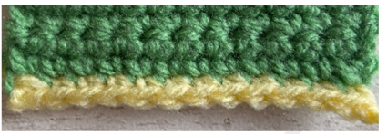 This method leaves one loop at the bottom edge of the crochet fabric (the front bottom loop). This works up tighter than I thought it would and keeps its shape well even when a border is added.