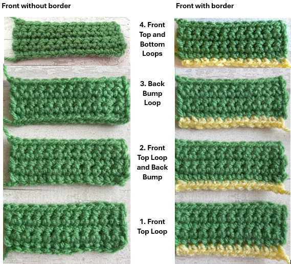 Each method of working into the front top loop, front bottom loop or the back bump will produce slight differences in how the bottom edge will look. This is explored further below.