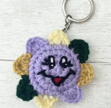 The gift I created, inspired by her toy, was a smiley flower keyring. My niece was so pleased with her keyring and so I decided to write up the pattern and share it. I loved everything about creating this keyring but . . . I did find the facial features so small and difficult to create. Hence in the pattern below I have simplified the facial features.